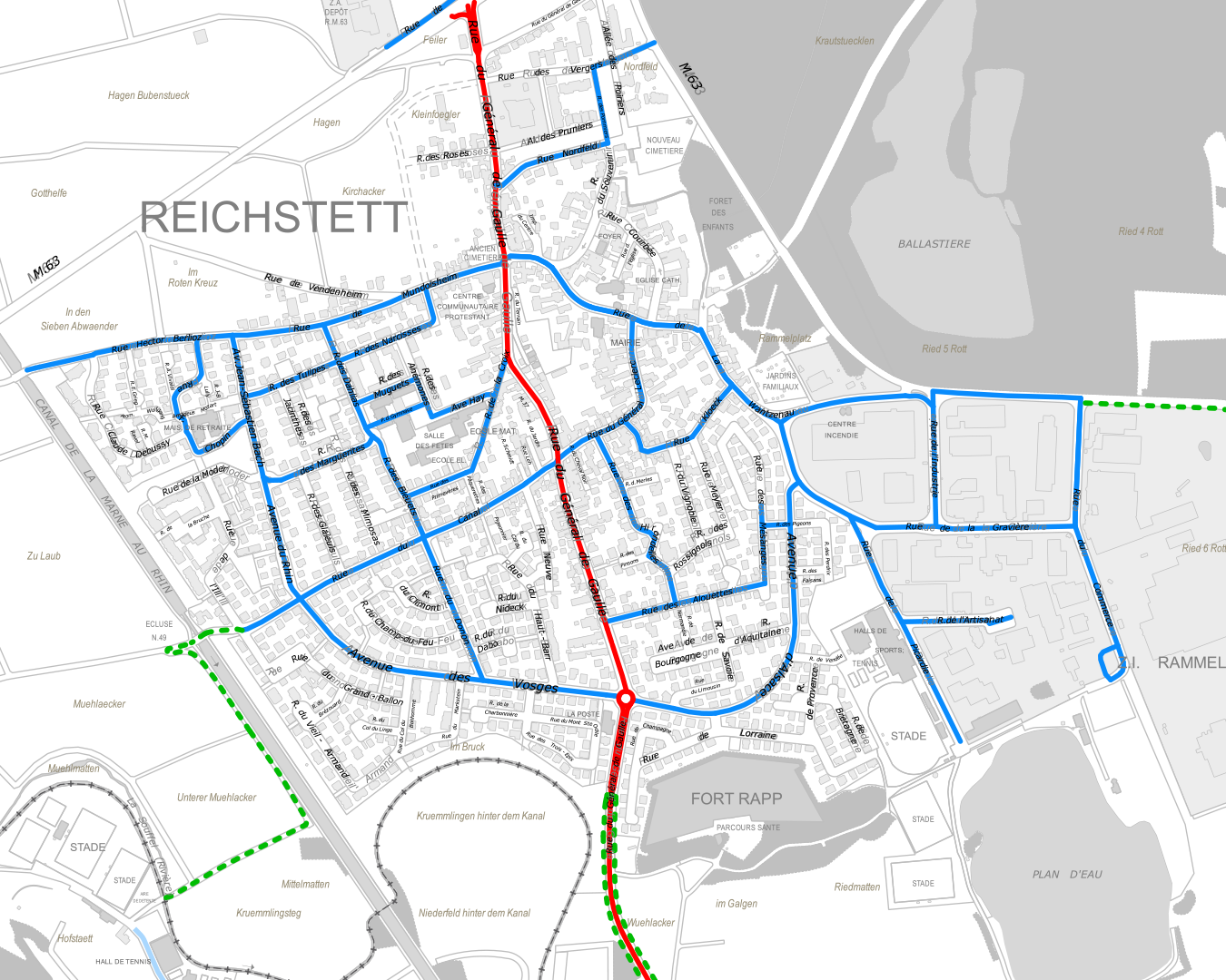 - Ces voies sont représentées en bleu sur le plan